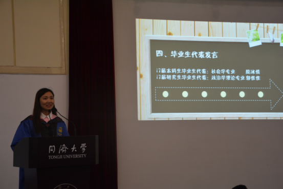 在毕业生感言环节,来自社会学专业殷冰倩和政治学理论专业郭佳佳同学,分别用真挚的语言代表本科生和研究生表达了毕业生的心声,在他们的肺腑之言中满含的是对母校、对学院太多的回忆和纪念,太多的感谢和祝福。毕业典礼,是结束也是开始,是终点也是起点,不论前路顺利或坎坷,相信继续深造的同学定会发扬格物穷理的精神,为学术界贡献自己的价值,走上工作岗位的同学也将在各行各业绽放光彩,努力成为国家和社会的栋梁。