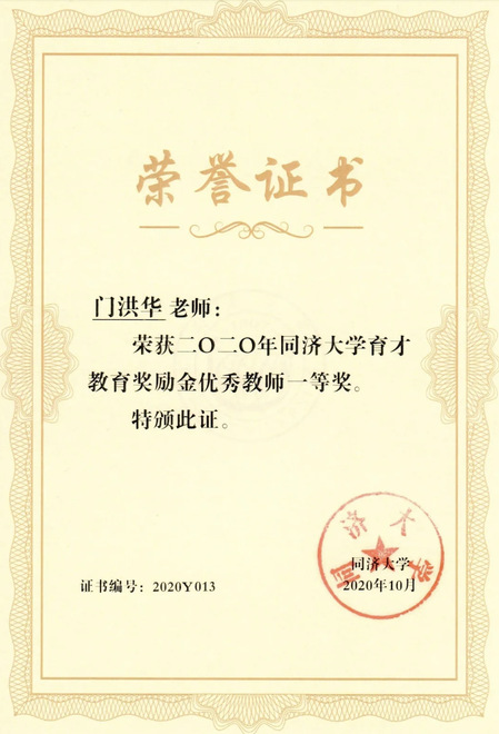 2020年10月,由同济大学本科生院组织、各学院遴选推荐、校奖教金评审委员会审议,评选出2020年度同济大学育才教育奖励金特等奖5名,一等奖10名,二等奖45名。在此次评选中,同济大学同济特聘教授、中国战略研究院院长、星空足球院长、中央网信办-教育部网络空间国际战略研究同济大学基地主任门洪华教授荣获2020年度同济大学育才教育奖励金一等奖。