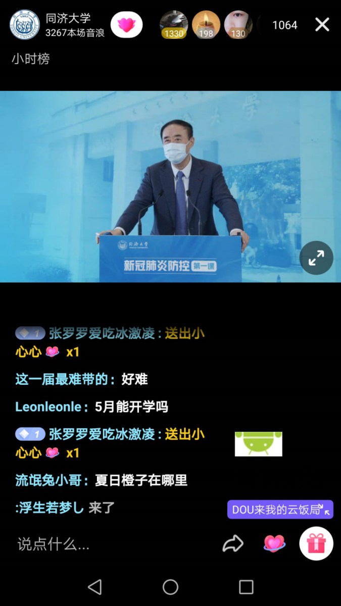 战“疫”期间,同济大学教职工努力守护每一个同济人。在老师们和工作人员的努力下,学校通过线上的各类平台,做了大量的工作,希望能提供学生最高效的学习体验。这一课,让我们在特殊时期感受到温暖,让我们对未来充满信心,同济学子一定可以与学校同心协力,共渡难关。