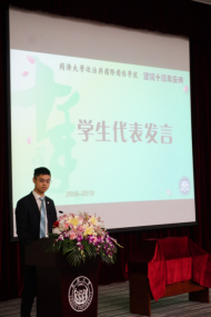 庆典的第四项议程为学生代表发言。2016级博士生王骁代表300余位在校学生和800余位院友送上祝福与感谢。王骁形象地将同济国政描绘为一个卓尔不群,梦想远大的少年,将同济国政人的气质用“勇、毅、诚、朴”四个字来概括。同济国政的勇是“不惧挑战,敢于担当”的智勇;毅是“同心同德、济世报国”的坚毅;诚是“海纳百川,包容天下”的诚意;朴是“自强不息,知行合一”的质朴。作为国政学子,要立志将这种自强不息的少年气质,一路传承下去。
