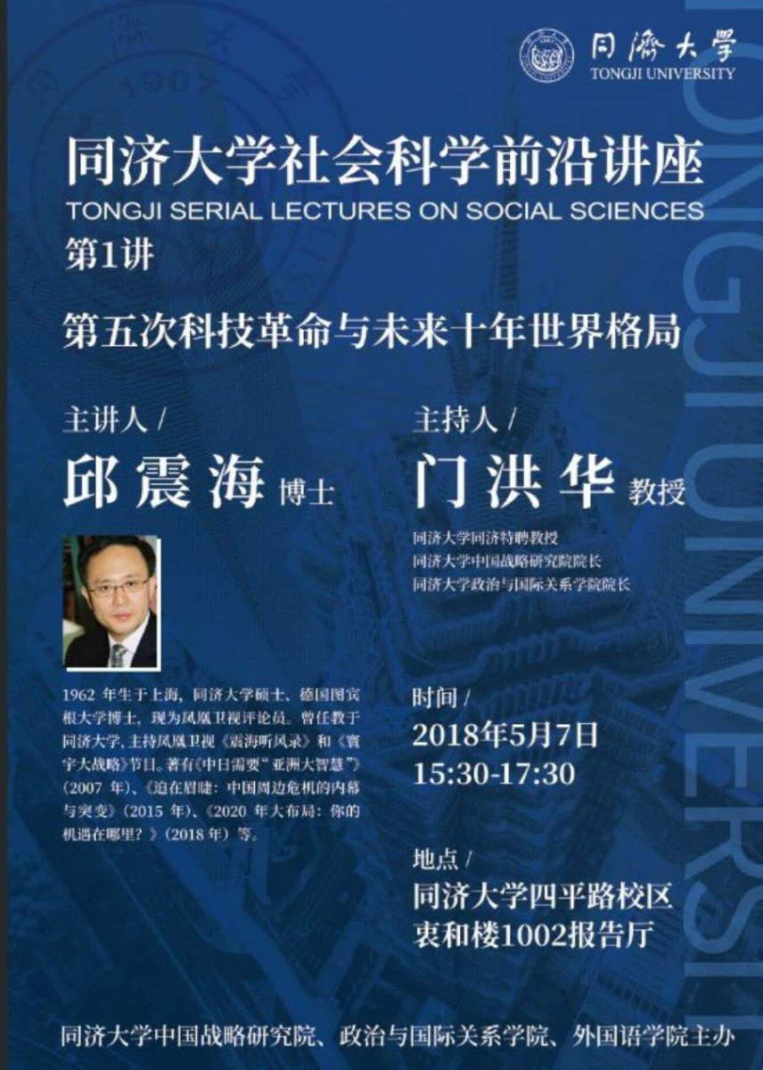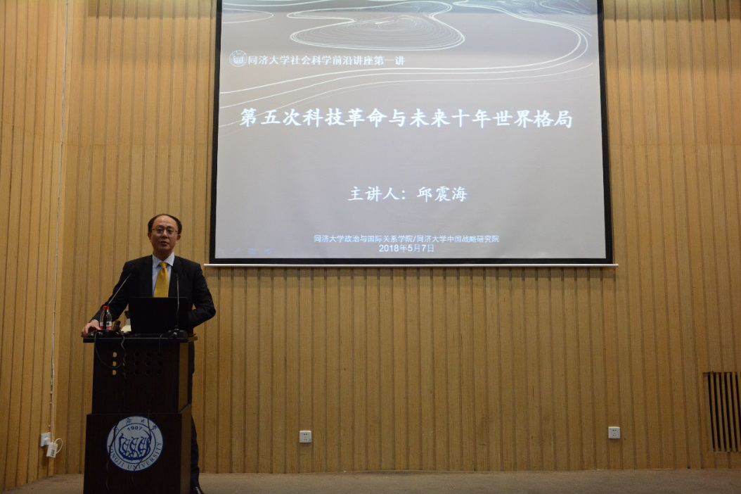 2018年5月7日,由同济大学中国战略研究院、星空足球、同济大学外国语学院联合主办的同济大学社会科学前沿讲座第一讲:“第五次科技革命与未来十年世界格局“在衷和楼1002报告厅成功举办。讲座主讲嘉宾为凤凰卫视评论员邱震海先生,星空足球院长门洪华教授主持本次讲座,外国语学院院长吴赟教授、星空足球党委书记徐红教授、星空足球副院长郑春荣教授、星空足球夏立平教授、邵春霞教授、星空足球和外国语学院100余名师生参加了本次讲座。这是同济大学社会科学群诸学院联袂组织的第一次专题讲座,标志着“同济大学社会科学前沿讲座”正式启航。