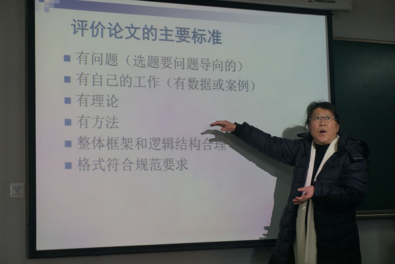 葛乃旭老师详细说明了毕业论文的评价标准,结合范文、案例讲解了开题报告和论文的构成要素、一般的逻辑框架,以及摘要、关键词、绪论、文献综述、结论等部分的写作要领。特别强调了论文的格式规范,列举了常见的错误。最后葛乃旭老师认为,重视格式规范的意义在于培养学生的规范意识、严谨有序的科学素养。王存刚副院长代表学院对葛乃旭老师的到来表示感谢,表达了学院对毕业论文指导工作的高度重视,希望广大师生切实提高毕业论文的质量,更好地实现人才培养的目标。