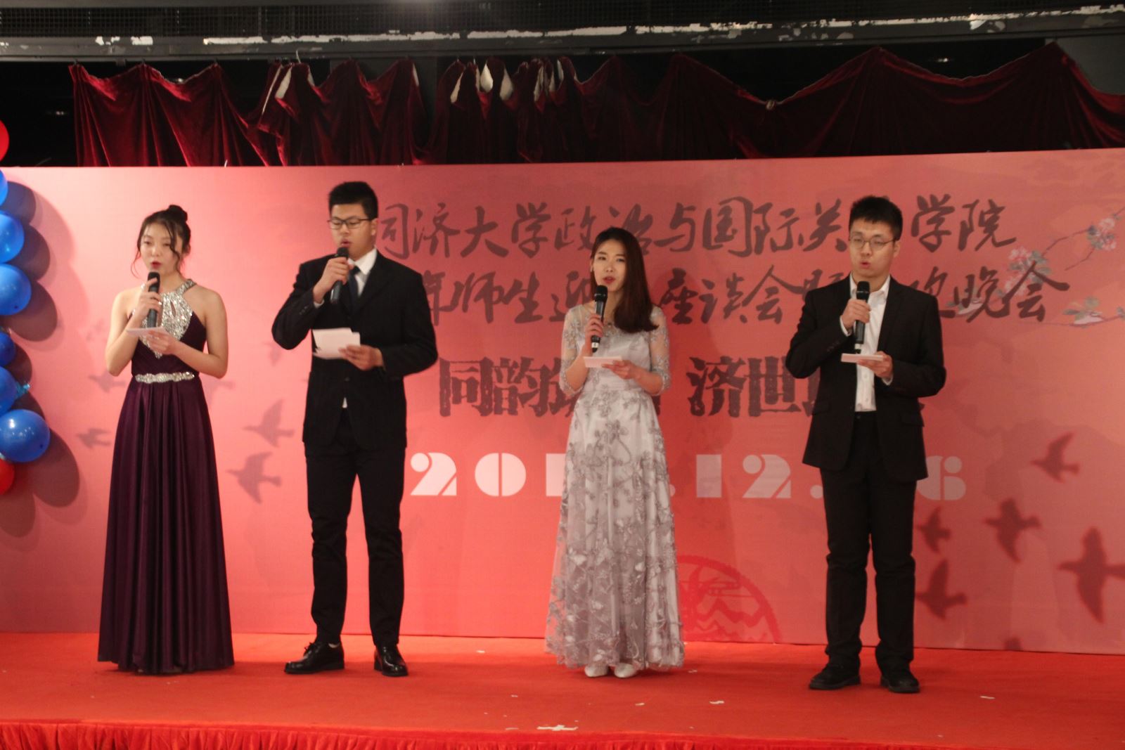 2017年12月26日,同济大学星空足球“同韵筑国,济世以政”师生迎新座谈会和迎双新联欢晚会圆满举办。学院院长门洪华教授、党委书记徐红书记出席,党委副书记宋波老师、副院长王存刚教授、院长助理钟振明老师、院长助理孙明老师、政治学系系主任孙磊老师及各专业教师代表参加座谈会。