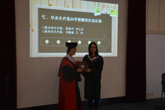 为了表达对学院、对导师的感恩和祝福,毕业生们除了节目汇报之外,还精心准备了别致的纪念礼物赠予学院,一日师恩,终身难忘;一朝国政人,一生国政情。党委书记徐红教授和教授委员会主任仇华飞教授代表学院郑重接收并合影留念。