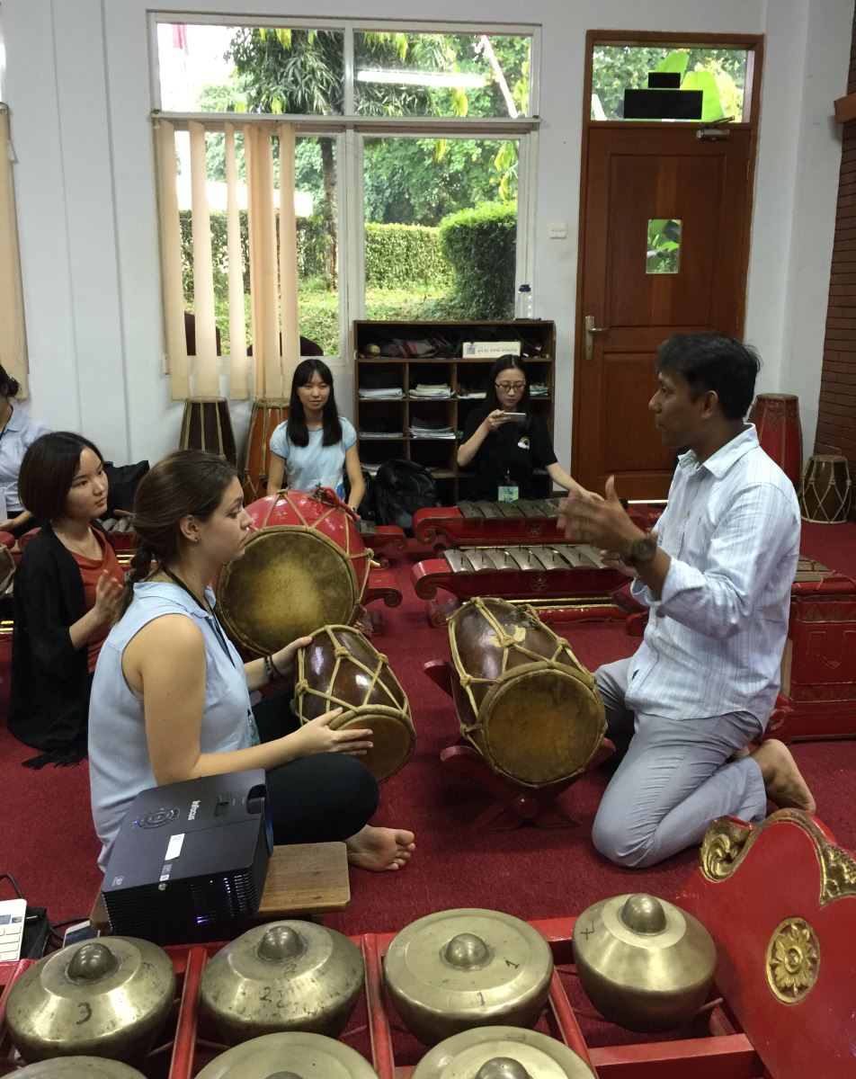 课程部分的印尼语言和文化工作坊给学生带来了有趣生动的文化体验,在印尼老师的耐心指导下,学生尝试演奏印尼传统乐器Gamelan和Arumba,学习传统舞蹈以及蜡染绘画。让同学们特别自豪的是,中日韩学生经过练习,和印尼音乐老师一起成功演奏了一首I have a dream。同学们用“一天像是过了一周”来形容初到雅加达的几天,每天的课程从早上9点到下午5点半,一天之中去往不同的教室,学习不同的课程内容。