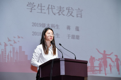 外交学系教师、2019级本科生班主任刘笑阳助理教授作为教师代表发言。刘老师向大家分享了关于快乐的法则:一是要心中有爱,包括付出与理解;二是肩上有责,以精英的标准要求自己,应当是同学们坚持不懈的责任;三是腹中有墨,以学习所带来的知识和阅历作为基础,才能以最美好的方式表达爱。刘老师指出,学习不仅是为了让自己懂得更多,也是要让自己相信的更少,用简约而坚定的信念去指导所知所行,仰观宇宙之大,俯察品类之盛,这就是简单的力量。最后刘老师引经据典,期待同学们在卓越的国政学院里成就卓越的人生。