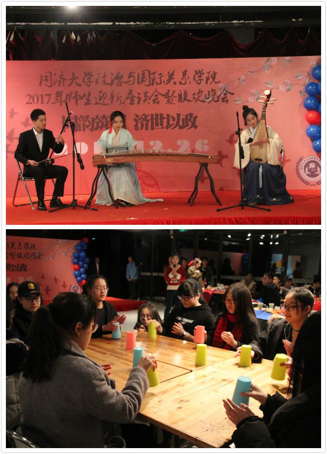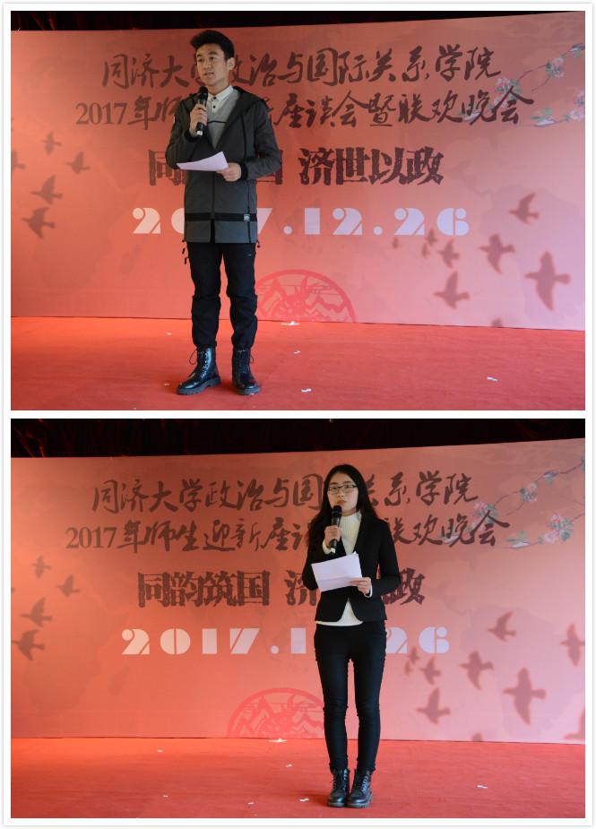 2017年12月26日,同济大学星空足球“同韵筑国,济世以政”师生迎新座谈会和迎双新联欢晚会圆满举办。学院院长门洪华教授、党委书记徐红书记出席,党委副书记宋波老师、副院长王存刚教授、院长助理钟振明老师、院长助理孙明老师、政治学系系主任孙磊老师及各专业教师代表参加座谈会。