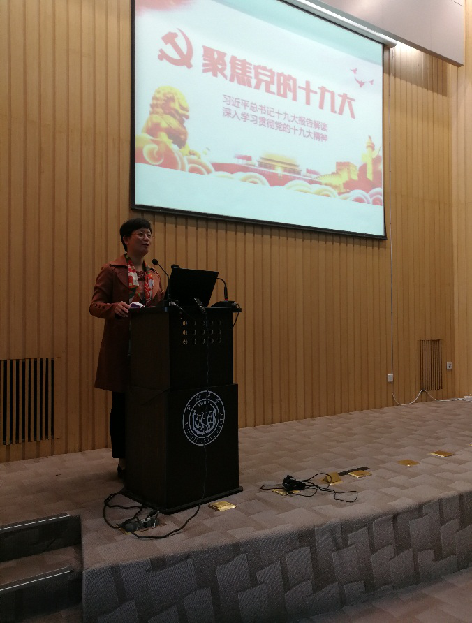 徐红书记首先介绍了我院师生通过各种形式观看、热议十九大的总体情况。其次,徐书记以聚焦党的十九大为题,系统而详细地回顾了十九大会议的精神,徐书记强调了充分认识学习贯彻落实十九大精神的重大意义,鼓励各个师生党支部积极开展形式多样的学习。