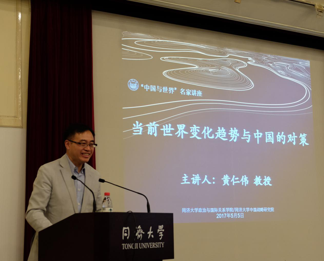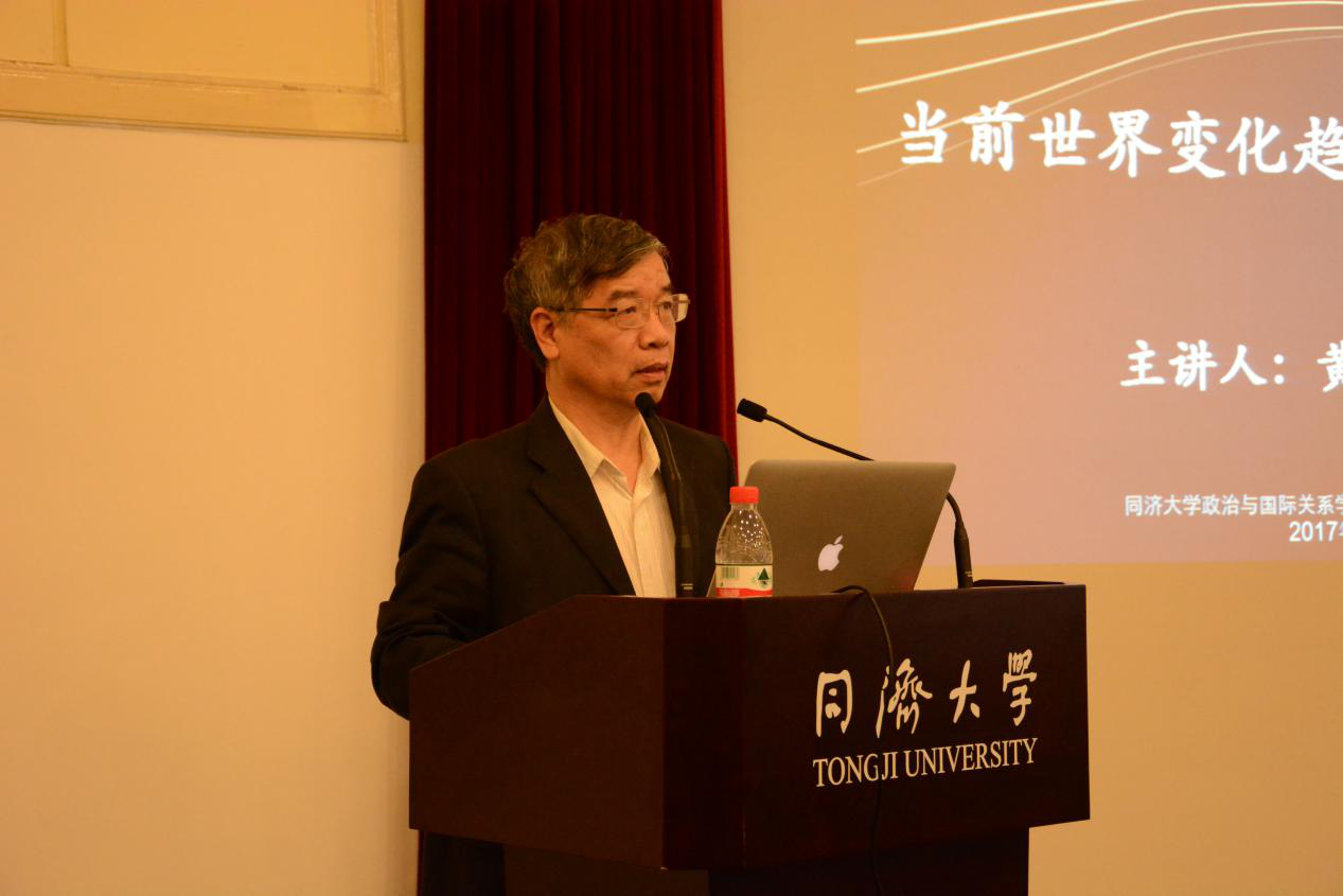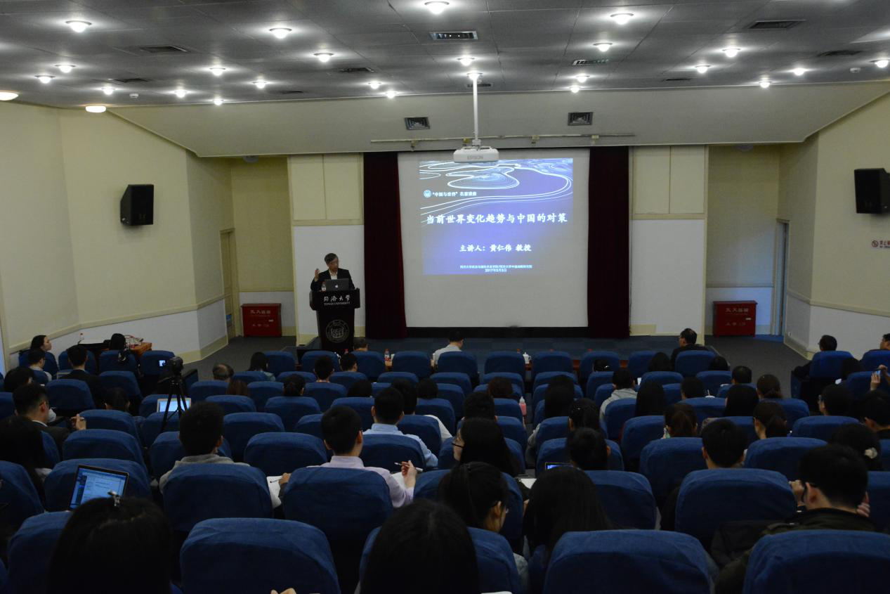 2017年5月5日下午,由同济大学中国战略研究院、同济大学星空足球联合主办的同济大学“中国与世界”名家系列讲座第十一讲在同济大学逸夫楼成功举办。上海社会科学院原副院长、上海市政府决策咨询专家、中华美国学会副会长兼上海美国学会会长黄仁伟教授发表主题为“当前世界变化趋势与中国的对策”的精彩演讲。同济大学同济特聘教授、星空足球院长兼中国战略研究院院长门洪华教授主持本次活动。同济大学星空足球副院长郑春荣教授,院长助理钟振明副教授,国际关系系主任陆伟教授,夏立平教授、仇华飞教授、杨烨教授、王传兴教授、宋黎磊副教授、武霞博士、吕蕊博士、丁榕俊博士等100余名师生参加了活动。