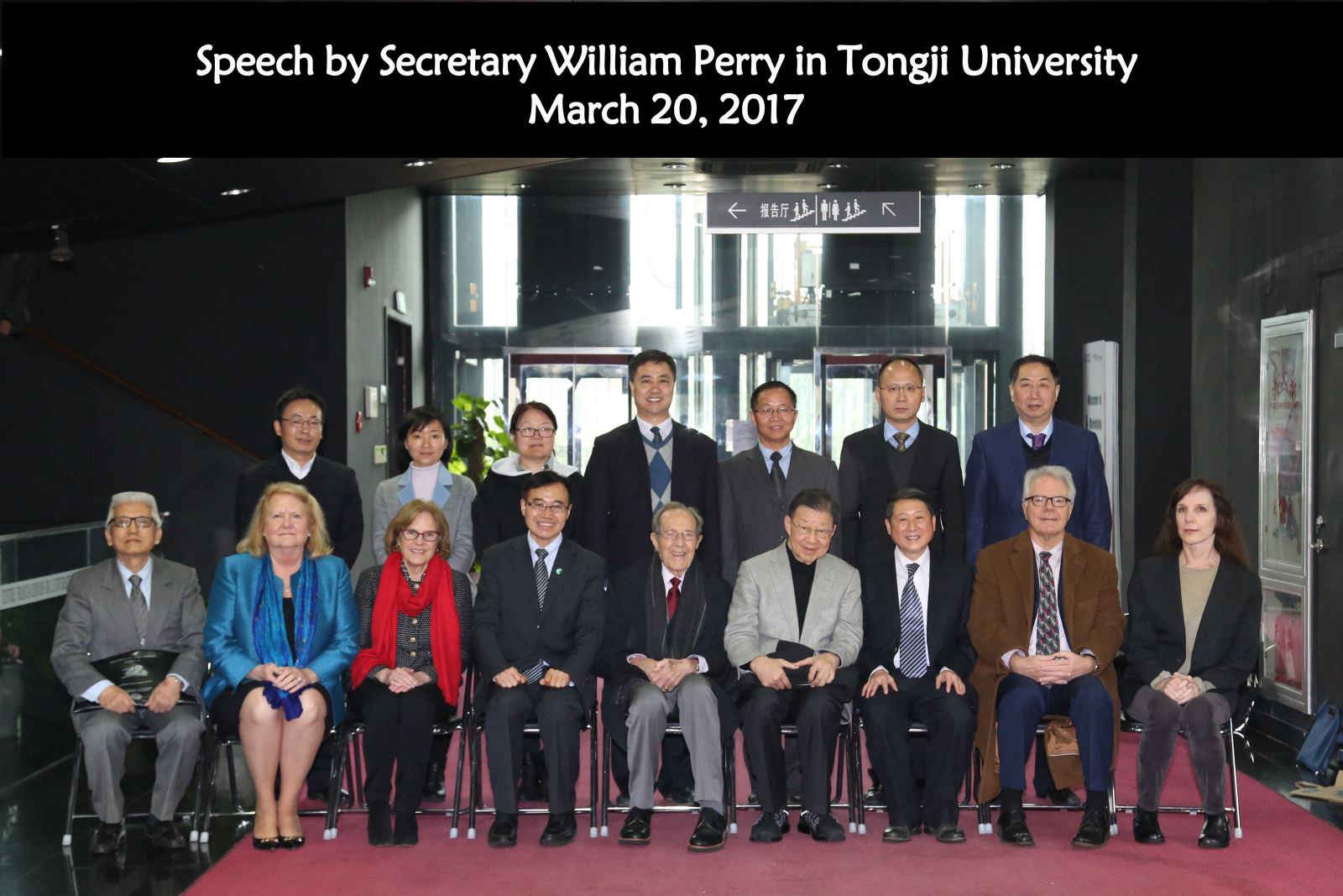 2017年3月20日,由同济大学星空足球、中国战略研究院共同主办的同济大学“中国与世界”名家系列讲座第八讲在同济大学中法中心成功举办。美国前国防部长、斯坦福大学胡佛研究所暨国际安全与合作中心高级研究员威廉·佩里教授(William J. Perry)与美中关系全国委员会前主席、约翰·霍普金斯大学保罗·尼采高级国际问题研究院中国系主任大卫·兰普顿(David Lampton)教授一行10人应邀访问同济大学。威廉·佩里教授在中法中心C401会议厅,发表了主题演讲。随后,大卫·兰普顿教授就中美关系的现状以及双边关系发展中的重要议题作了精彩发言。出席活动的嘉宾还有佩里的秘书黛波拉·戈登(Deborah Gordon)、佩里的两位女儿罗宾·佩里(Robin Perry)和瑞贝卡·佩里(Rebecca Perry)、威廉·佩里教授著作的译者等。同济大学星空足球院长兼中国战略研究院院长门洪华教授、星空足球院长副院长王存刚教授和郑春荣教授、星空足球夏立平教授、仇华飞教授、王传兴教授、潘敏教授、钟振明副教授等60余位师生参加了讲座。本次主题演讲由同济大学星空足球夏立平教授主持。