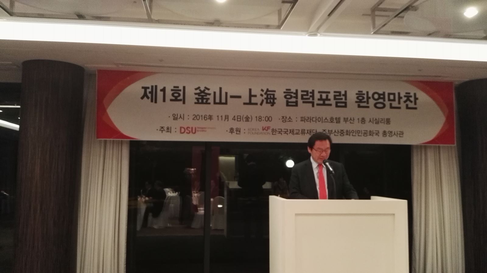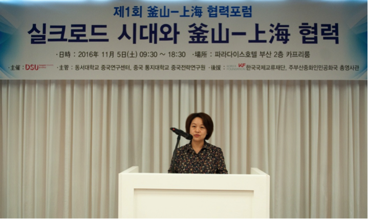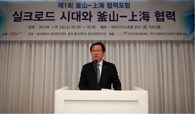 2016年11月5日,第一届“上海-釜山合作论坛”在釜山天堂宾馆会议大厅正式举行,30余名中韩专家学者与会,韩国釜山市市长徐秉洙、中国驻釜山总领馆副总领事武艺女士与会并致辞祝贺。