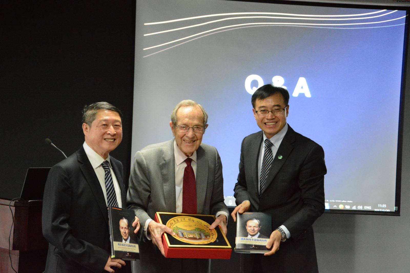 活动的最后,门洪华院长代表同济大学星空足球、中国战略研究院,向两位到访的嘉宾和佩里博士的两个双胞胎女儿赠送了同济大学110周年校庆纪念礼物,佩里先生还自费购买同济大学T恤衫留念。同时,佩里教授向与会师生慷慨馈赠了他最新出版的著作中文版,并热情地为大家签字留念。参与本次活动的教师与同学都表示深受启发,与嘉宾进行了积极而热烈的交流,活动取得了圆满的成功。