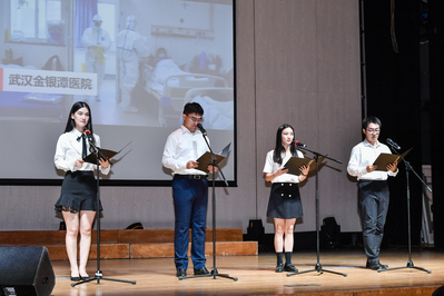 典礼过程中,学院师生还带来了精彩的节目表演。欧华轩、冯俊鹏和朱舒扬同学为我们带来了一曲优美动人的乐器合奏《彩云追月》,钢琴、古琴和古筝的合鸣悠然自得,节奏张弛有度,使音乐在眼前浮现出一幅开阔旷远的画面。大家欣赏了诗朗诵《追光向未来》,同学们铿锵的话语与坚定的眼神倾诉着同济国政学子对未来的希冀与向往,观国政以经世济民,察社会方格物致知,这就是我们的热血与情怀。学院师生合唱《仰望星空》,希望国政学子脚踏实地,心怀梦想,追寻自己的那一片星空。最后一个节目是由孙孟琪、冯骏鹏、汪婷和王雨辰同学带来的原创诗朗诵《同心抗疫》。正如诗歌最后所说的,“无畏汗流浃背或沐露沾霜,国政学子始终充满信心与力量,满腔热血如火般滚烫,国政学子终将撑起民族的脊梁”,国政学子的担当与信念在疫情之下变得更加坚定和滚烫。