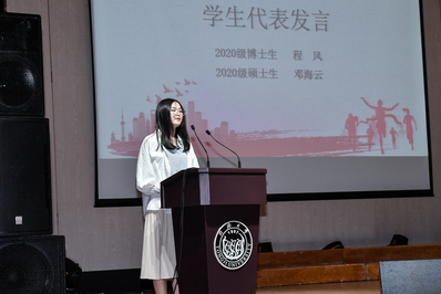 在新生代表发言的环节中,2020级博士新生程风分享了他的经历与感悟。从毕业到迎新,他学会了告别,同时也学会了成长,他告诉我们人生的新篇章要坚定从容,砥砺前行。他认为,经世治国,尽才情于社稷;恭身行道,付青春于黎民,这是中国士人的初心,也是每一个国政学院学生应有的情怀。