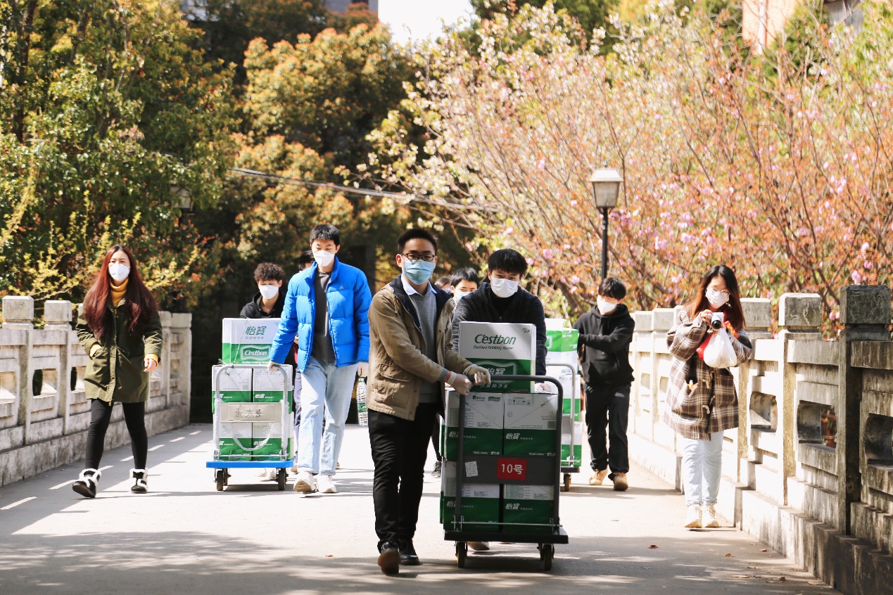 面对部分封控的楼宇,志愿者们迅速集结,为同学们带去一车车的物资与餐食,保障每一位同学的饮食与生活需要。