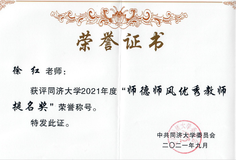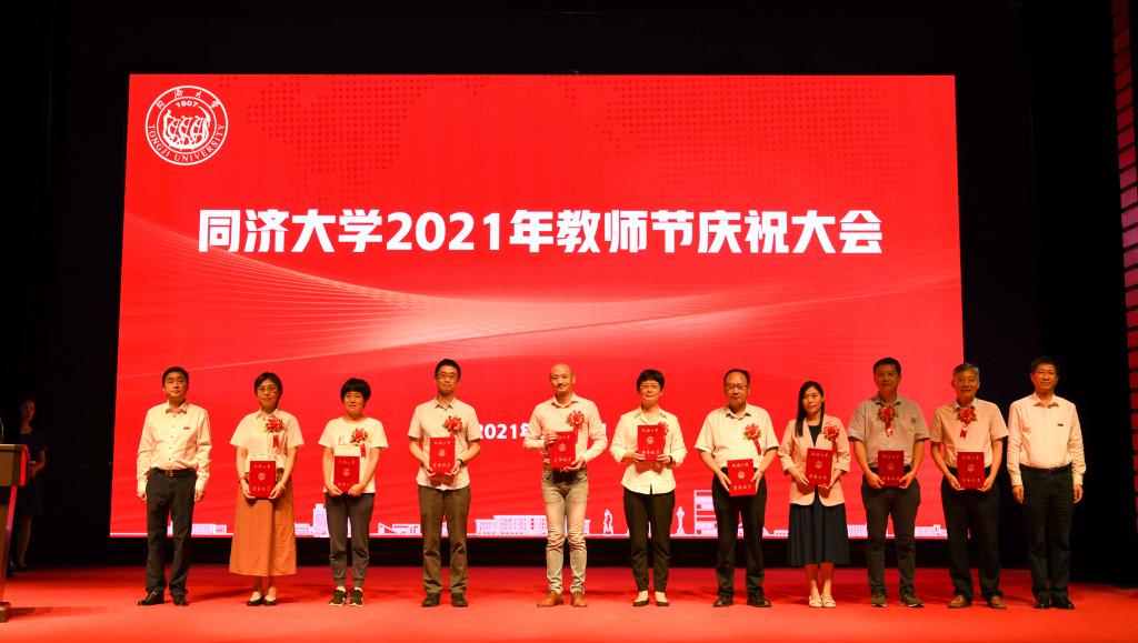 赓续百年初心,担当育人使命。9月10日,同济大学2021年教师节庆祝大会在四平路校区一·二九礼堂举行,校长陈杰等全体在校校领导出席,2021年获得上海市和同济大学重要荣誉称号的教师代表以及30年教龄教师、退休教师、新进教师、一线教师、各职能部门和院系主要负责人、学生代表近300人参加大会。陈杰发表讲话,大会由校党委常务副书记冯身洪主持。今年,学校有18位教职工获“上海市育才奖”,戈宝学等10位教师获评同济大学“师德师风优秀教师”,我院徐红等10位教师获同济大学“师德师风优秀教师提名奖”。