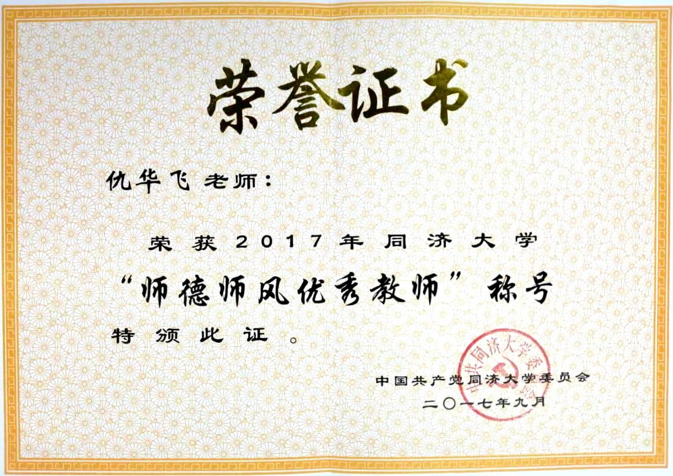 仇华飞教授获得2017年度同济大学“师德师风优秀教师”奖