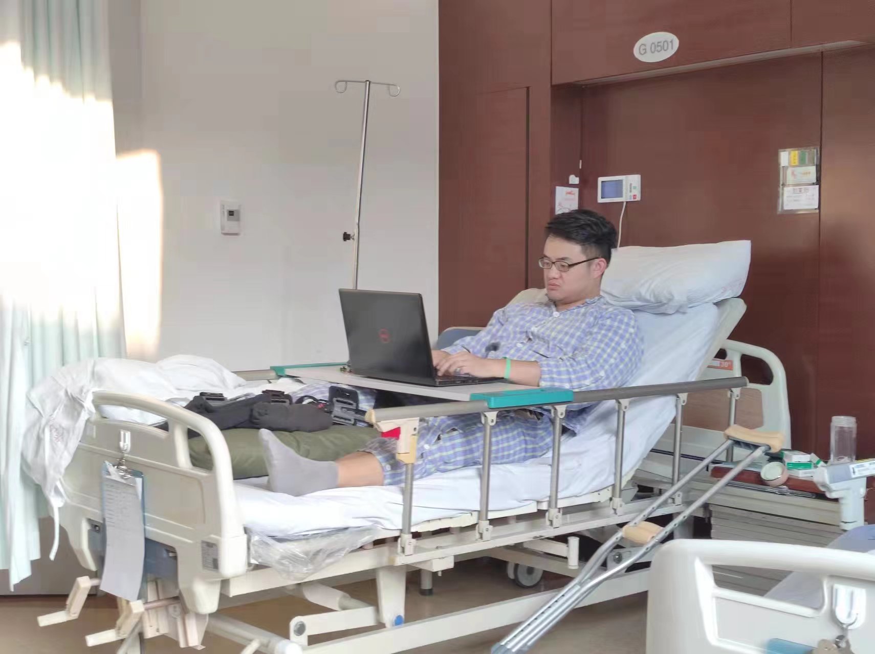 上海疫情之前的2月下旬,刘笑阳老师由于膝盖韧带断裂进行了重建手术,至少需要一个季度的周期才能完全复原。在恢复的头一个月里,虽然无法到校参与相关活动,但刘笑阳老师仍然借助云端为同学们授课答疑、为学院提供服务支持,从未影响正常的教学和行政工作。三月中旬,虽然走路还要佩戴护具、拄着拐杖,但他仍然第一时间做好了重返学校授课和工作的准备。