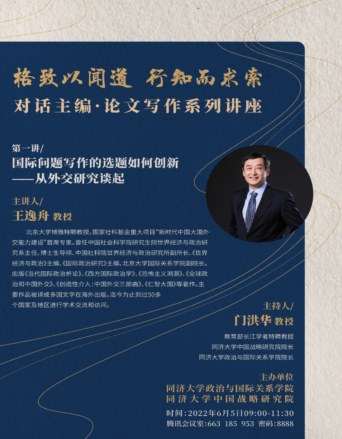 On the morning of June 5, 2022, the first lecture of the "Dialogue with the Chief Editor - Academic Writing" series, hosted by the School of Political Science & International Relations / the Institute for China & World Studies of Tongji University, was successfully held. Professor Wang Yizhou, a Boya distinguished professor at Peking University and Chief Editor of The Journal of International Studies, was invited to give a lecture on "How to Write Innovative Articles on International Issues - From Diplomatic Studies". More than 700 students and teachers from 78 universities at home and abroad attended this webinar, which was moderated by Professor Men Honghua, a distinguished professor of the Changjiang Scholars Program, President of the Institute for China & World Studies and Dean of the School of Political Science & International Relations of Tongji University.