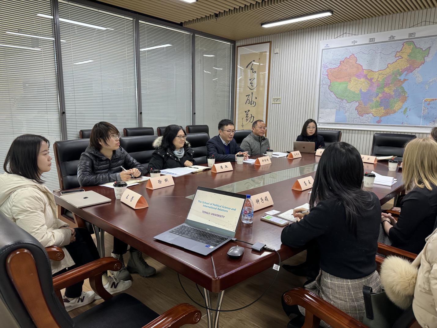 Professor Zhong Zhenming, Vice Dean of the School of Political Science and International Relations, chaired the meeting. Also in attendance were Xu Li from the Foreign Affairs Office of Tongji University; Professor Wang Chuanxing from the School of Political Science and International Relations; Professor Pan Min, Deputy Director of the Polar and Oceanic International Issues Research Center; Professor Song Lilei, Deputy Director of the European Studies Center; Wu Di, Assistant Professor and Foreign Affairs Secretary of the School; and Assistant Professor Wang Lei.