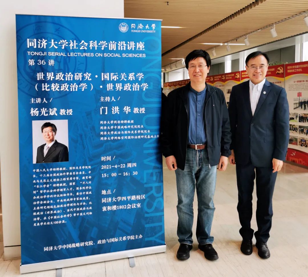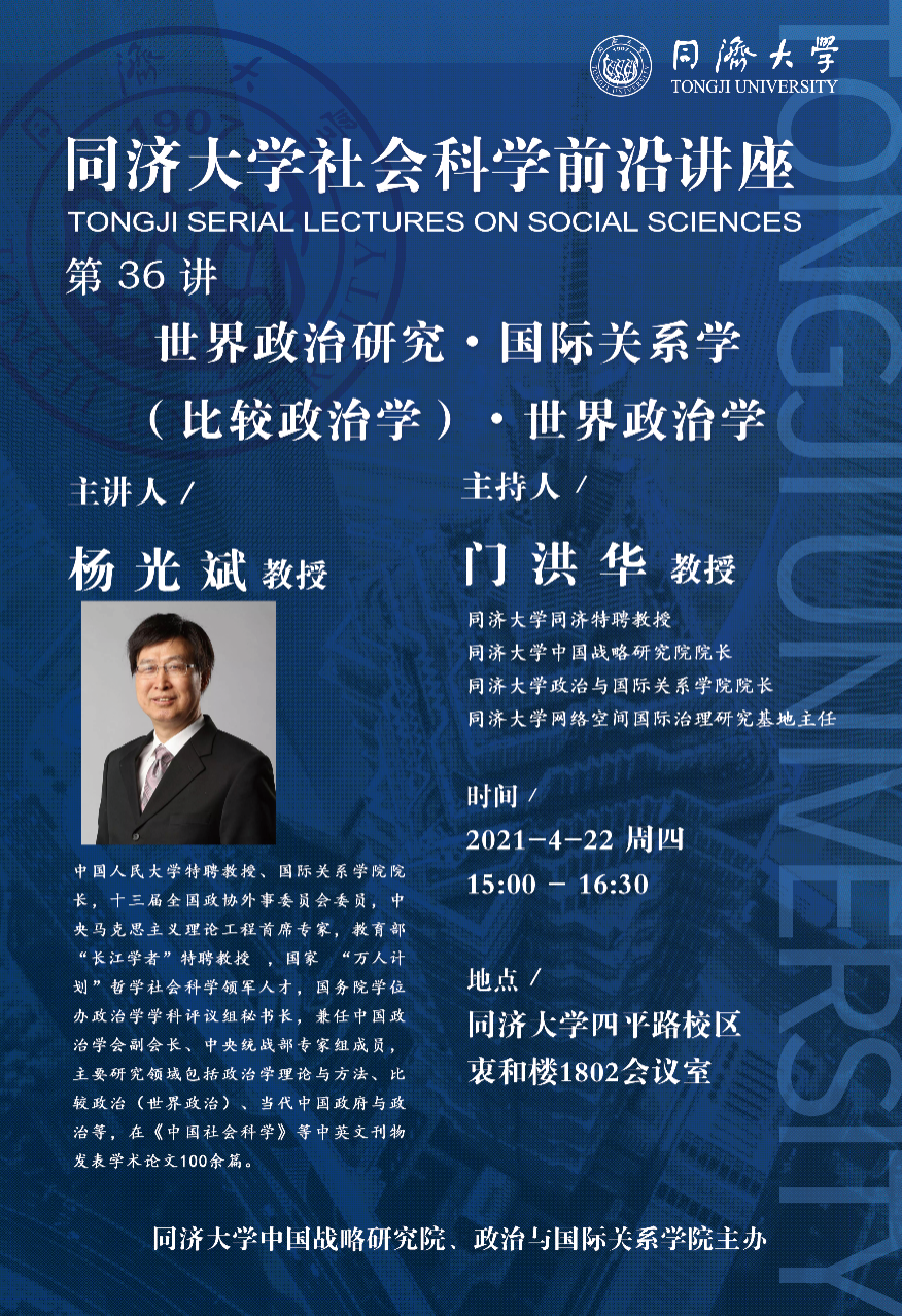 The 36th session of “Tongji Serial Lectures on Social Sciences” was successfully held by the Institute for China & World Studies and the School of Political Science & International Relations, Tongji University in Conference Room 1802, Zhonghe Building, Tongji University on April 22, 2021. Professor Yang Guangbin from the School of International Studies, Renmin University of China, was specially invited to deliver a keynote speech themed “World Politics Studies, International Relations (Comparative Politics), and World Political Science”. The lecture was moderated by Professor Men Honghua, President of the Institute for China & World Studies and Dean of the School of Political Science & International Relations, Tongji University. Professor Song Wei, Director of the Department of International Politics, the School of International Studies, Renmin University of China, attended the lecture as a guest. Nearly 50 teachers, doctoral students and master students from the School of Political Science & International Relations of Tongji University listened to the lecture.