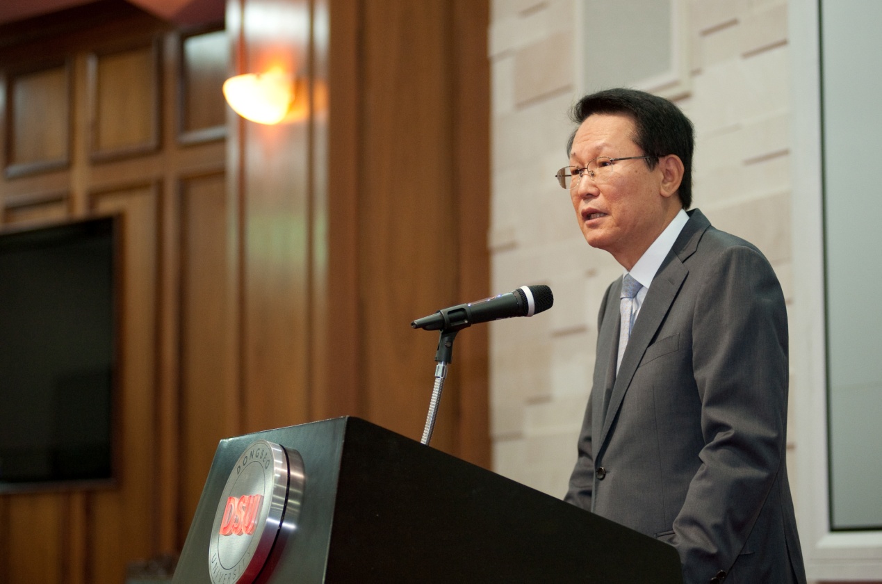 On October 13, themed “Changes in the Situation on the Korean Peninsula and Busan-Shanghai Cooperation”, the forum officially kicked off in the International Conference Hall on the sixth floor of Minseok Library, DSU. In the opening speech, Ambassador Shin Jung-seung, Director of the Center for Chinese Studies of DSU, introduced the background of this forum and the main guests attending this forum. DSU President Prof. Chang Je-kuk delivered a welcome speech on behalf of DSU and extended a warm welcome to the participants from China and South Korea.